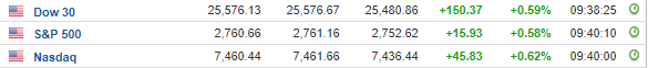 Περί τις 16:30, ο Dow Jones σημειώνει άνοδο 0,5% στις 25.552 μονάδες, ο S&P 500 ενισχύεται κατά 0,5% στις 2.757 μονάδες, ενώ ο Nasdaq κινείται κατά 0,5% υψηλότερα, στις 7.452 μονάδες.