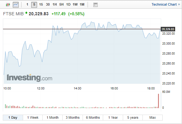 Ο FTSE MIB στο Μιλάνο έκλεισε με άνοδο 0,58% στις 20.329,83 μονάδες, με τις τράπεζες να καταγράφουν σημαντικά κέρδη, εν μέσω των προσδοκιών για νέο TLTRO.