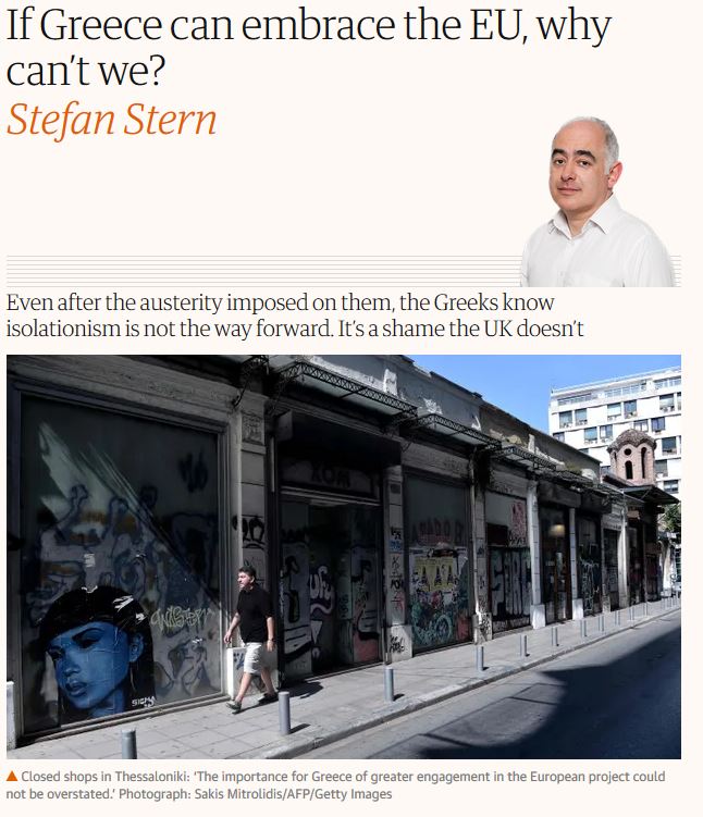Με αναφορές στην Ελλάδα αλλά και το γεγονός ότι παρ' όλο που έφτασε ένα βήμα πριν την έξοδο από την ΕΕ, τελικά… συμβιβάστηκε, ο συγγραφέας Stefan Stern με άρθρο του στον Guardian καλεί τη Βρετανία να αναθεωρήσει τα περί… Brexit.