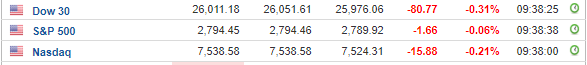 Με ήπιες απώλειες άνοιξαν σήμερα (26/2/2019) οι δείκτες της Wall Street, με το ενδιαφέρον να επικεντρώνεται στις εμπορικές διαπραγματεύσεις ανάμεσα στις ΗΠΑ και στην Κίνα, καθώς και σε εταιρικά αποτελέσματα, ενώ οι επενδυτές αναμένουν και την κατάθεση του προέδρου της Ομοσπονδιακής Τράπεζας των ΗΠΑ (Federal Reserve, Fed), στο Κογκρέσο.