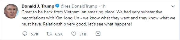 «Ευτυχής που επέστρεψα από το Βιετνάμ, ένα φανταστικό μέρος», ανέφερε με ανάρτησή του στο «Twitter» ο Trump.
