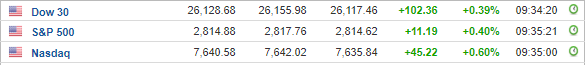 Περί τις 16:30, ο Dow Jones ενισχύεται κατά 0,4% στις 26.141 μονάδες, ο S&P 500 σημειώνει άνοδο 0,5% στις 2.817 μονάδες, ενώ ο Nasdaq κινείται κατά 0,6% υψηλότερα, στις 7.642 μονάδες.