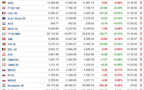 Στη Φρανκφούρτη ο δείκτης DAX υποχώρησε κατά 0,08% κι έκλεισε στις 11.592,66 μονάδες, ο FTSE 100 στο Λονδίνο σημείωσε άνοδο 0,39% στις 7.134,39 μονάδες, ενώ ο CAC 40 στο Παρίσι έκλεισε με κέρδη 0,51% στις 5.286,57 μονάδες.