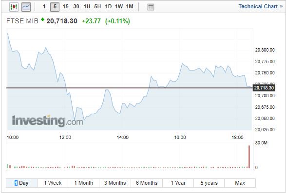 Στο Μιλάνο ο FTSE MIB ενισχύθηκε κατά 0,11% κι έκλεισε στις 20.718,30 μονάδες.