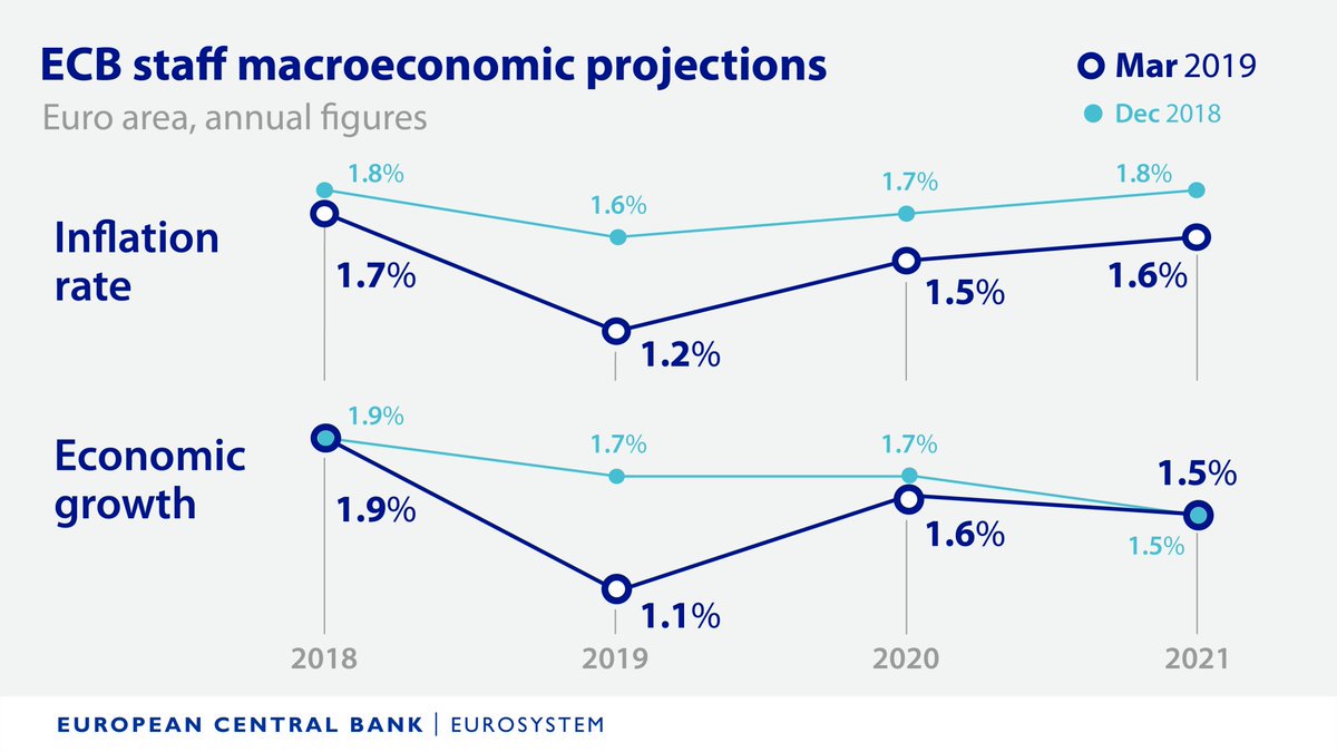Ειδικότερα, η ΕΚΤ αναμένει η ανάπτυξη να διαμορφωθεί στο +1,1% το 2019, από +1,7% που ανέμενε προηγουμένως, και στο +1,6% το 2020, από +1,7% προηγουμένως, ενώ η εκτίμηση για το 2021 παρέμεινε αμετάβλητη, στο +1,5%.