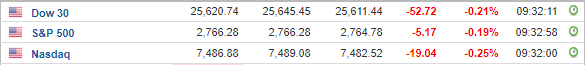 Περί τις 16:30, ο Dow Jones υποχωρεί κατά 0,4% στις 25.567 μονάδες, ο S&P 500 σημειώνει πτώση 0,5% στις 2.759 μονάδες, ενώ ο Nasdaq κινείται κατά 0,6% χαμηλότερα στις 7.461 μονάδες.
