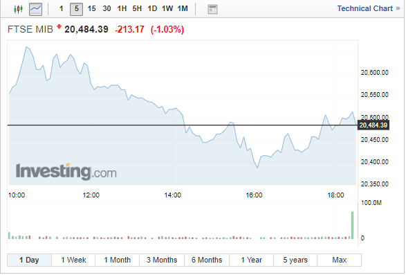 Ο FTSE MIB στο Μιλάνο έκλεισε με απώλειες 1,03% στις 20.484,39 μονάδες.