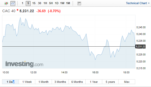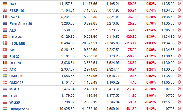 Στη Φρανκφούρτη, ο δείκτης DAX υποχώρησε κατά 0,52% κι έκλεισε στις 11.457,84 μονάδες, ο FTSE 100 στο Λονδίνο σημείωσε πτώση 0,74% στις 7.104,31 μονάδες, ενώ ο CAC 40 στο Παρίσι έκλεισε με απώλειες 0,70% στις 5.231,22 μονάδες.