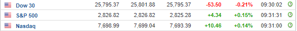 Περί τις 15:30, ο Dow Jones υποχωρεί κατά 0,1% στις 25.819 μονάδες, ο S&P 500 σημειώνει άνοδο 0,2% στις 2.828 μονάδες, ενώ ο Nasdaq κινείται κατά 0,2% υψηλότερα, στις 7.705 μονάδες.