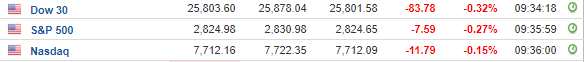 Περί τις 15:30, ο Dow Jones υποχωρεί κατά 0,2% στις 25.827 μονάδες, ο S&P 500 σημειώνει πτώση 0,2% στις 2.827 μονάδες, ενώ ο Nasdaq κινείται κατά 0,1% χαμηλότερα στις 7.721 μονάδες.