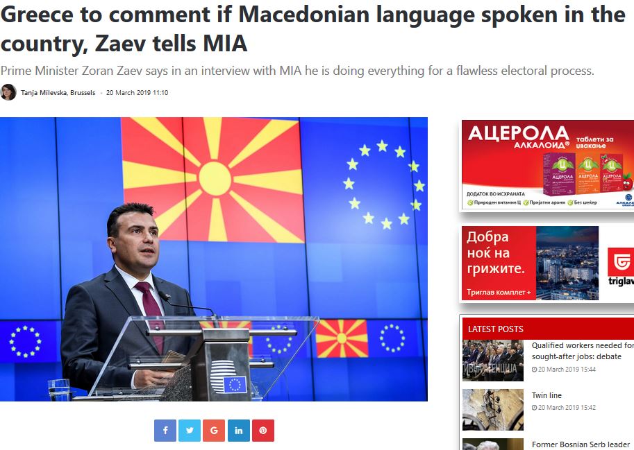 Σε συνέντευξή του στο σκοπιανό πρακτορείο ειδήσεων MIA, o Zaev επανέλαβε πως με τη Συμφωνία των Πρεσπών η Ελλάδα αναγνώρισε την ύπαρξη «μακεδονικής γλώσσας» στα Σκόπια.