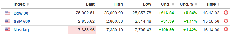 Ο Dow Jones ενισχύθηκε 0,84% στις 25.962 μονάδες, ο S&P 500 σημείωσε άνοδο 1,11% στις 2.855 μονάδες, ενώ ο Nasdaq κινήθηκε κατά 1,42% υψηλότερα, στις 7.838 μονάδες.
