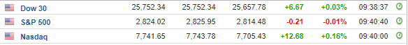 Περί τις 15:30, ο Dow Jones υποχωρεί κατά 0,2% στις 25.693 μονάδες, ο S&P 500 σημειώνει πτώση 0,2% στις 2.819 μονάδες, ενώ ο Nasdaq κινείται κατά 0,2% χαμηλότερα, στις 7.714 μονάδες.