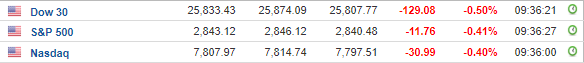 Περί τις 15:30, ο Dow Jones υποχωρεί κατά 0,4% στις 25.854 μονάδες, ο S&P 500 σημειώνει πτώση 0,4% στις 2.843 μονάδες, ενώ ο Nasdaq κινείται κατά 0,4% χαμηλότερα στις 7.807 μονάδες.
