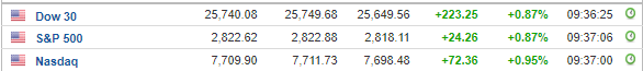 Περί τις 15:30, ο Dow Jones ενισχύεται κατά 0,9% στις 25.739 μονάδες, ο S&P 500 σημειώνει άνοδο 0,8% στις 2.821 μονάδες, ενώ ο Nasdaq κινείται κατά 0,9% υψηλότερα στις 7.707 μονάδες.
