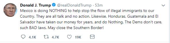 Ίσως κλείσουμε τα νότια σύνορα!», ανέφερε ο Trump με ανάρτησή του στο «Twitter».