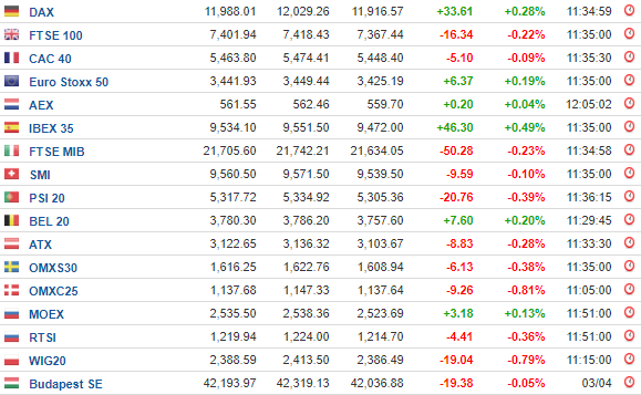 Με μεικτά πρόσημα και οριακές μεταβολές έκλεισαν σήμερα (4/4/2019) τα κυριότερα χρηματιστήρια της Ευρώπης, με τους δείκτες να υποχωρούν από τα υψηλά 8 μηνών, καθώς οι επενδυτές αναμένουν τις εξελίξεις στις εμπορικές διαπραγματεύσεις ΗΠΑ - Κίνας.