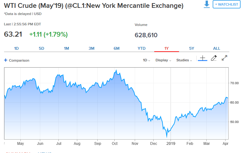 Παράλληλα, το προθεσμιακό συμβόλαιο Μαΐου 2019 για το αμερικανικό αργό εμφάνισε κέρδη της τάξης του 1,79% στα 63,21 δολάρια, φθάνοντας στο υψηλότερο επίπεδο πέντε εβδομάδων, ενώ σε εβδομαδιαία βάση η άνοδός του έφθασε στο 4,9%