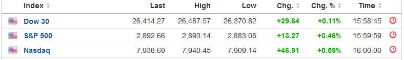 Ο Dow Jones ενισχύθηκε 0,11% στις 26.414 μονάδες, ο S&P 500 σημείωσε άνοδο 0,46% στις 2.892 μονάδες, ενώ ο Nasdaq κινήθηκε κατά 0,59% υψηλότερα στις 7.938 μονάδες.