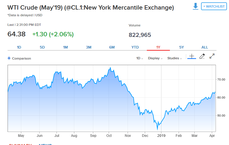 Παράλληλα, το προθεσμιακό συμβόλαιο Μαΐου 2019 για το αμερικανικό αργό είχε άνοδο της τάξεως του +2,06% στα 64,38 δολ. ανά βαρέλι.