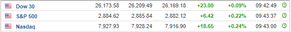 Περί τις 16:30, ο Dow Jones ενισχύεται κατά 0,2% στις 26.195 μονάδες, ο S&P 500 σημειώνει άνοδο 0,3% στις 2.885 μονάδες, ενώ ο Nasdaq κινείται κατά 0,2% υψηλότερα, στις 7.926 μονάδες.