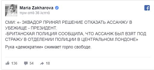 Σε διαφορετικό μήκος κύματος η Ρωσία, με τον D. Peskov, εκπρόσωπο του προέδρου Putin να εκφράζει την ελπίδα ότι τα δικαιώματα του Assange θα γίνουν σεβαστά.
