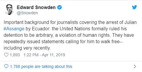 Ο ΟΗΕ επανειλημμένα έχει προβεί σε ανακοινώσεις, μέχρι και πρόσφατα, μέσω των οποίων ζητούσε την απελευθέρωση» του Ασάνζ, έγραψε ο Snowden στον λογαριασμό του στο Twitter.