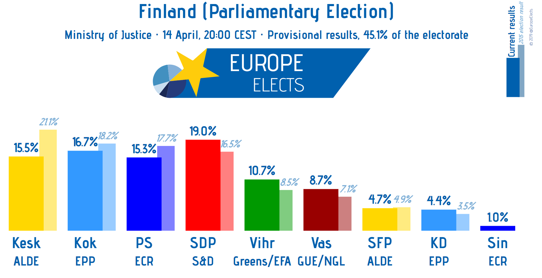 Στην τρίτη θέση βρίσκεται το Κεντρώο Κόμμα του πρωθυπουργού Juha Sipila με ποσοστό 15,5%, ενώ ακολουθεί το εθνικιστικό κόμμα «Αληθινοί Φιλανδοί» με 15,3%.