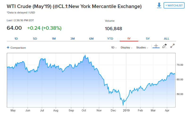 Σύμφωνα με τα επίσημα στοιχεία της Αμερικανικής Υπηρεσίας Πληροφοριών Ενέργειας, τα αποθέματα αργού στις ΗΠΑ για την εβδομάδα που ολοκληρώθηκε στις 12 Απριλίου 2019 σημείωσαν πτώση της τάξεως των 1,4 εκατ. βαρελιών, την ίδια στιγμή μάλιστα που οι αναλυτές εκτιμούσαν ότι η πτώση θα διαμορφωθεί στα 1,2 εκατ. βαρέλια συνολικά.