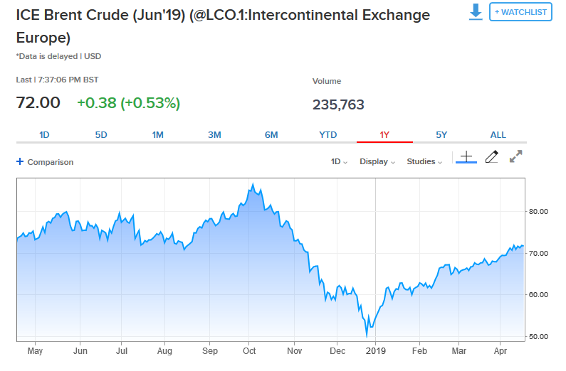 Ειδικότερα, το προθεσμιακό συμβόλαιο Ιουνίου 2019 είχε άνοδο της τάξεως του +0,53% στα 72 δολ. ανά βαρέλι, την ίδια στιγμή που το προθεσμιακό συμβόλαιο Μαΐου 2019 για το αμερικανικό αργό ενισχύθηκε +0,38% με την τιμή του να διαμορφώνεται στα 64 δολ. ανά βαρέλι.