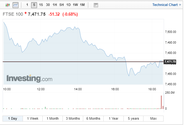 Στο Λονδίνο, ο FTSE 100 υποχώρησε κατά 0,68% στις 7.471,75 μονάδες, ο CAC 40 στο Παρίσι έκλεισε με πτώση 0,28% στις 5.576,06 μονάδες, ενώ ο FTSE MIB στο Μιλάνο διολίσθησε κατά 0,79% στις 21.724,44 μονάδες.