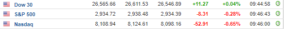 Περί τις 16:30, ο Dow Jones ενισχύεται κατά 0,1% στις 26.579 μονάδες, ο S&P 500 σημειώνει πτώση 0,2% στις 2.938 μονάδες, ενώ ο Nasdaq κινείται κατά 0,5% χαμηλότερα στις 8.120 μονάδες.