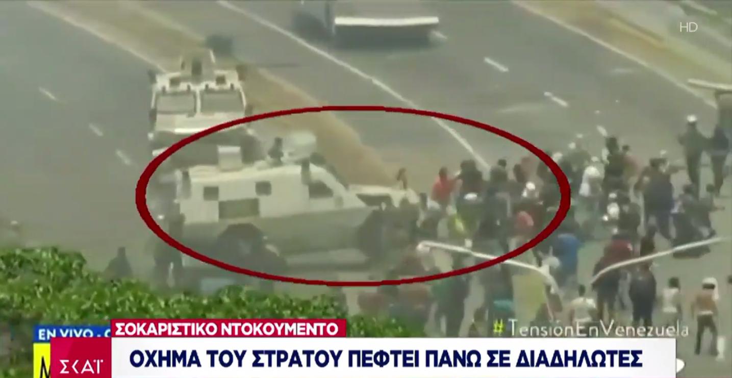 Όχημα της Εθνοφρουράς της Βενεζουέλας παρέσυρε διαδηλωτές που είχαν συγκεντρωθεί έξω από την στρατιωτική βάση Λα Καρλότα στο Καράκας, όπως μεταδίδει το «Reuters».