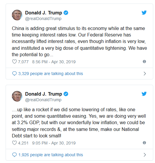 Ο Trump επιτέθηκε, εκ νέου, μέσω του αγαπημένου του μέσου κοινωνικής δικτύωσης Twitter, φέρνοντας, μάλιστα, ως παράδειγμα την Κίνα, προσθέτοντας ότι εάν η νομισματική πολιτική στις ΗΠΑ ήταν πιο χαλαρή, η «οικονομία θα είχε εκτοξευθεί σαν πύραυλος».