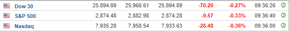 Περί τις 16:30, ο Dow Jones υποχωρεί κατά 0,2% στις 25.908 μονάδες, ο S&P 500 σημειώνει πτώση 0,2% στις 2.877 μονάδες, ενώ ο Nasdaq κινείται κατά 0,3% χαμηλότερα, στις 7.941 μονάδες.