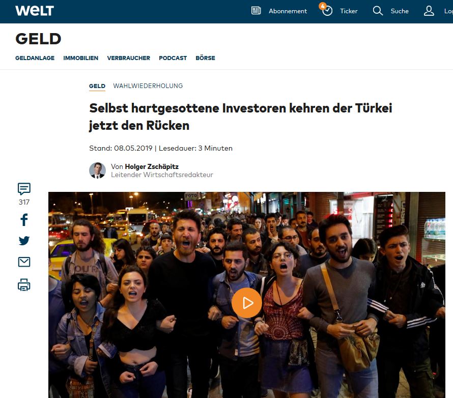 Την θέση ότι ακόμα και ριψοκίνδυνοι επενδυτές γυρίζουν την πλάτη στην Τουρκία διατυπώνει σε δημοσίευμα της η γερμανική εφημερίδα Die Welt με αφορμή και την απόφαση των τουρκικών Αρχών για την επανάληψη των τοπικών εκλογών στην Κωνσταντινούπολη.