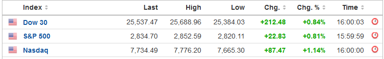 O Dow Jones ενισχύθηκε κατά 0,84% στις 25.537 μονάδες, ο S&P 500 σημείωσε άνοδο 0,81% στις 2.834 μονάδες, ενώ ο Nasdaq κινήθηκε κατά 1,14% υψηλότερα στις 7.734 μονάδες.