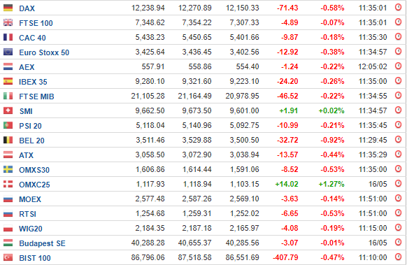 Υπό πίεση βρέθηκαν σήμερα (17/5/2019) τα κυριότερα χρηματιστήρια της Ευρώπης, εν μέσω ανησυχιών για την κλιμάκωση της εμπορικής αντιπαράθεσης ΗΠΑ - Κίνας, αλλά και για το Brexit, μετά την κατάρρευση των συνομιλιών μεταξύ της κυβέρνησης της Βρετανίας και της αντιπολίτευσης.