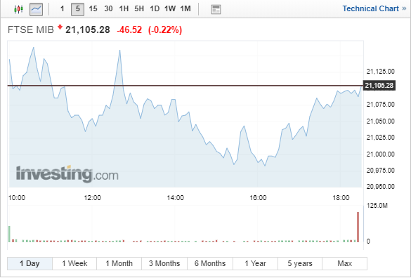 Ο FTSE MIB στο Μιλάνο υποχώρησε κατά 0,22% κι έκλεισε στις 21.105,28 μονάδες, μετά και τις νέες εμπρηστικές δηλώσεις από την ιταλική κυβέρνηση.