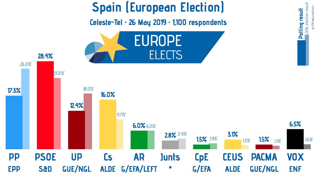 Το ακροδεξιό κόμμα Vox εκλέγει τους πρώτους ευρωβουλευτές του, καταλαμβάνοντας τέσσερις ως πέντε έδρες, σύμφωνα πάντα με τη δημοσκόπηση.