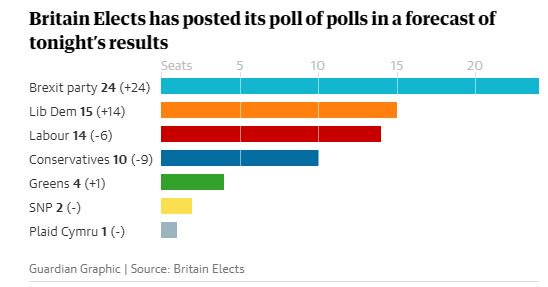 Σύμφωνα με τις εκτιμήσεις της Britain Elects το κόμμα Brexit εκλέγει 24 βουλευτές στο ευρωπαϊκό κοινοβούλιο, οι Φιλελεύθεροι Δημοκράτες 15 έδρες, οι Εργατικοί 14 έδρες, οι Συντηρητικοί 10% και οι Πράσινοι 4 έδρες.