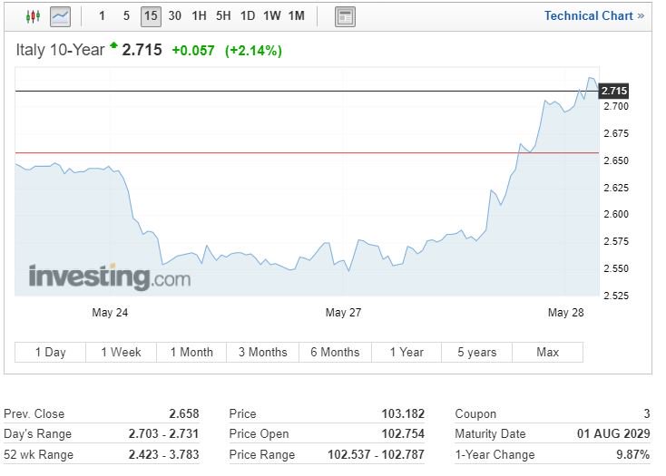 Άλμα στο 2,7% καταγράφει η απόδοση του 10ετούς ομολόγου στην Ιταλία, λόγω της πιθανότητας να ξεκινήσει τη διαδικασία υπερβολικού ελλείμματος και μάλιστα στις 5 Ιουνίου 2019.