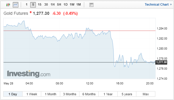 Η τιμή του χρυσού παραδόσεως Ιουνίου έκλεισε σήμερα με πτώση 6,5 δολ. ή 0,5%, στα 1.277,10 δολ. ανά ουγγιά.