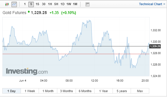 Η τιμή του χρυσού παραδόσεως Ιουνίου έκλεισε με κέρδη 80 σεντς ή 0,1%, στα 1.328,70 δολ. ανά ουγγιά