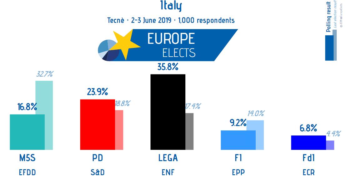 Με βάση τις τελευταίες δημοσκοπήσεις η Lega του Matteo Salvini έχει εκτοξευθεί στο 37% που αποτελεί ρεκόρ για ακροδεξιό κόμμα ενώ αντιθέτως το Κίνημα 5 Αστέρων υποχωρεί στο 17%.