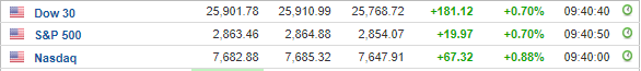 Περί τις 16:30, ο Dow Jones ενισχύεται κατά 0,6% στις 25.875 μονάδες, ο S&P 500 σημειώνει άνοδο 0,7% στις 2.862 μονάδες, ενώ ο Nasdaq κινείται κατά 0,8% υψηλότερα, στις 7.676 μονάδες.