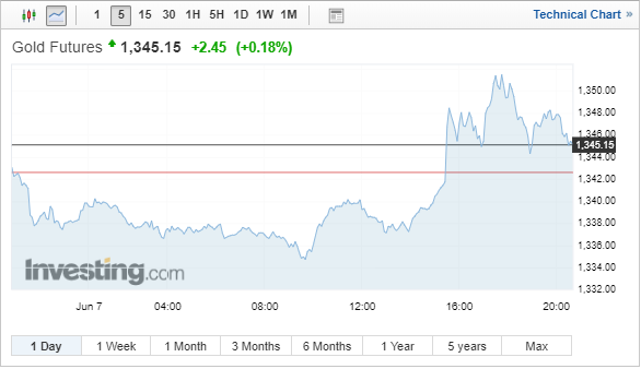 Η τιμή του χρυσού παραδόσεως Ιουνίου έκλεισε με κέρδη 3,40 δολ. ή 0,3%, στα 1.346,10 δολ. ανά ουγγιά