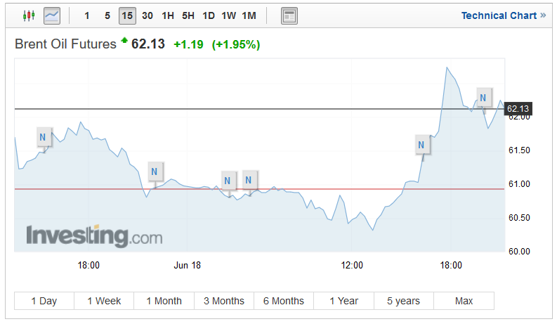 Ειδικότερα, το προθεσμιακό συμβόλαιο Αυγούστου 2019 για το Brent ενισχύθηκε 1,95% με την τιμή του να διαμορφώνεται στα 62,13 δολ. ανά βαρέλι, την ίδια στιγμή που το προθεσμιακό συμβόλαιο Ιουλίου 2019 για το αμερικανικό αργό εμφάνισε ράλι με κέρδη της τάξεως του 3,68% στα 54,09 δολ. ανά βαρέλι.