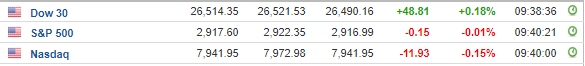 Περί τις 16:30, ο Dow Jones ενισχύεται κατά 0,2% στις 26.510 μονάδες, ο S&P 500 σημειώνει άνοδο 0,1% στις 2.920 μονάδες, ενώ ο Nasdaq κινείται κατά 0,1% υψηλότερα, στις 7.962 μονάδες.