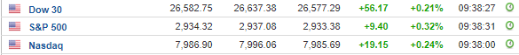 Περί τις 16:30, ο Dow Jones ενισχύεται κατά 0,3% στις 26.596 μονάδες, ο S&P 500 σημειώνει άνοδο 0,3% στις 2.934 μονάδες, ενώ ο Nasdaq κινείται κατά 0,2% υψηλότερα, στις 7.987 μονάδες.